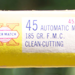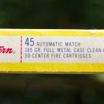 These Western [logo] cartridges with 185 grains Full Metal Case clean cutting bullets are especially designed to give the highest degree of accuracy in match competition. Non-corrosive priming and smokeless powder. Adapted to all standard arms chambered for this cartridge. We warrant the exercise of reasonable care in the manufacture of these cartridges, but make no other warranty, expressed or implied.